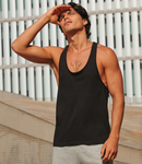 Single jersey. Self fabric bound neckline and armholes. Racer back style. Side seams. Longer length. Twin needle straight hem. 85% cotton/15% viscose. 110g