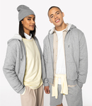 85% organic combed cotton/15% recycled polyester. Sherpa lined. French terry inner. Enzyme washed. Drop shoulder style. Straight fit. Two panel sherpa lined hood with self colour drawcord. Recycled metal eyelets and drawcord tips. Overstitching around the hood. Herringbone taped neck. Full length zip. Front pouch pockets. 1 x 1 ribbed cuffs and hem. Twin needle stitching. Tag free. Recycled polyester is made from post-consumer waste.